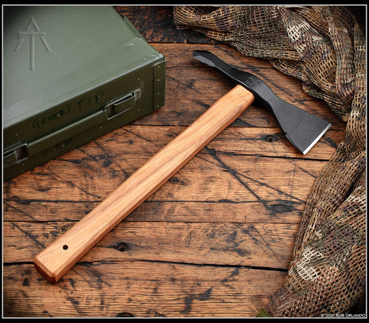Tomahawk heads forged in TN from American 1060 steel, Tennessee hickory handles made in our own shop, nylon handles made in the USA, Kydex and leather sheaths made in house.