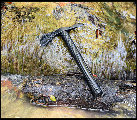 Tomahawk heads forged in TN from American 1060 steel, Tennessee hickory handles made in our own shop, nylon handles made in the USA, Kydex and leather sheaths made in house.